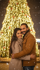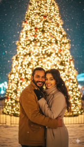 A romantic holiday night scene of a couple (use our photo as couple photo face with 100% accurate here) standing closely in front of a large illuminated Christmas tree. Pose & Interaction: The couple stands looking at camera with smile, arms wrapped around each other, create a image Outfits & Accessories: Woman wears a neutral wool coat, scarf, long hair loose. Man wears a brown winter jacket. her hair is high volumed open and straight with curls at ends. Environment & Background: Large outdoor Christmas tree filled with warm white lights, people blurred in background. Foreground: Falling snowflakes softly visible. Lighting: Strong warm backlight from tree, soft face illumination. Color Grading: Golden festive tones, soft contrast, cinematic holiday look. Camera Angle: Eye-level medium shot, symmetrical framing. Technical: 50mm lens, f/1.8, creamy bokeh