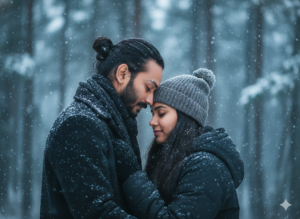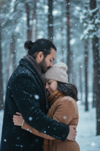 create a image An intimate close-up winter portrait of a couple (use our photo as couple photo face with 100% accurate here) embracing tightly in a snowy outdoor setting. Pose & Interaction: The man gently presses his forehead against the woman’s head while wrapping both arms around her. The woman closes her eyes, resting peacefully against his chest. The moment feels emotional, protective, and deeply intimate. Outfits & Accessories: Both wear thick winter coats in muted earth tones. The woman wears a light knit beanie and a mustard-brown scarf wrapped around her neck. The man wears a dark coat and scarf, with light stubble on his face. Environment & Background: A softly blurred winter forest background with heavy snowfall. No visible buildings, pure nature setting. Foreground Details: Snowflakes sharply visible near the lens, snow resting on coats, scarves, and hair. Lighting: Soft natural winter daylight, diffused and gentle, no harsh highlights. Color Grading: Moody cinematic grading with cool blue-gray tones, soft contrast, warm skin highlights, emotional film look. Camera Angle & Composition: Tight close-up shot, slightly angled from the side, shallow depth of field isolating faces. Technical Details: Ultra-realistic, 4K, DSLR portrait, 85mm lens look, f/1.8 aperture, soft background bokeh, fine film grain.
