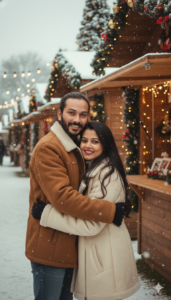 create a image A joyful winter market scene featuring a couple (use our photo as couple photo face with 100% accurate here) standing at decorated wooden stalls and snow-covered trees. Pose & Interaction: The man hugs the woman from the side, smiling toward camera. her hair has high volumed and long straight and curls at ends. Outfits & Accessories: Shearling coats, winter gloves. Environment & Background: Wooden Christmas stalls, garlands, snow-covered fir trees, festive décor. Foreground: Snowy ground and fence details. Lighting: Soft winter daylight mixed with warm festive lights. Color Grading: Warm vintage Christmas palette, slight film fade. Camera Angle: Eye-level medium shot, candid framing. Technical: 35mm lens, f/2.8.