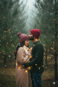 create a image A dreamy holiday evening portrait of a couple (use our photo as couple photo face with 100% accurate here) standing in a pine forest, wrapped in glowing string lights. Pose & Interaction: The man gently kisses the woman’s forehead. The woman closes her eyes peacefully, hands resting near his chest. Both stand very close, bodies aligned. Outfits & Accessories: Man wears a green sweater, casual winter pants, and a red knit beanie. Woman wears a loose beige knit sweater, scarf, and a colorful knitted beanie. Warm fairy lights are loosely wrapped around both of them. Environment & Background: Dense pine trees, dusk lighting, faint fog in the distance. Foreground: Glowing fairy lights crossing the frame. Lighting: Low-light dusk with warm fairy-light illumination on faces. Color Grading: Moody green tones with warm golden highlights, cinematic holiday look. Camera Angle: Eye-level medium portrait, shallow depth of field. Technical: 35mm lens look, f/1.8, soft bokeh, film grain.