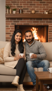 create a image A cozy indoor winter lifestyle scene of a couple (use our photo as couple photo face with 100% accurate here) sitting close together on a fabric sofa in front of a lit fireplace. Pose & Interaction: Both hold white ceramic coffee cups. They lean toward each other smiling, elbows relaxed, knees angled inward. looking at camera. Outfits & Accessories: Woman wears a light beige knit sweater dress, leggings, and cream ankle boots. her hair is high volumed with straight and curls at end. Man wears a gray cable-knit sweater, blue jeans, and brown leather boots. Environment & Background: Rustic living room with brick fireplace, wooden mantel, warm décor. Foreground: Small wooden coffee table with cups partially visible. Lighting: Warm fireplace glow mixed with soft ambient indoor lighting. Color Grading: Warm beige, caramel browns, soft highlights, cozy lifestyle tones. Camera Angle: Eye-level seated shot, medium-wide framing. Technical: 35–50mm lens look, f/2.5, ultra-realistic, high detail.