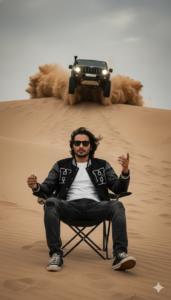 Create a dramatic, cinematic portrait set in an open desert landscape with rolling sand dunes under an overcast sky. In the foreground, a confident man sits casually on a lightweight folding chair, legs relaxed and spread, completely unfazed by the chaos behind him. His posture is calm and dominant, projecting fearless confidence and effortless cool. He has medium-length, wild, windblown dark hair, light stubble, and wears dark rectangular sunglasses. His outfit blends rugged street style with attitude: a black varsity jacket with bold lettering on the chest, a white t-shirt underneath, dark jeans, and casual footwear. One hand rests on the arm of the chair holding a small object casually, while the other is lifted mid-gesture, reinforcing his relaxed, boss-like demeanor. Behind him, frozen mid-air, a large off-road SUV launches dramatically over the sand, fully airborne with all four wheels off the ground. Sand and dust explode outward beneath the vehicle, captured in sharp detail. The headlights glow faintly yellow, adding intensity and realism to the action. The composition creates a powerful contrast between stillness and motion: the subject remains calm and grounded while explosive action unfolds just meters behind him. Lighting is natural and cinematic, with soft shadows and muted highlights. Use aspect ratio 4:5. use my uploaded photo for reference.