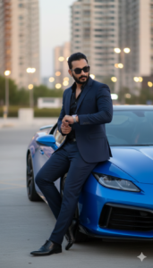 Create a luxury lifestyle portrait of a confident, well-dressed adult man leaning casually against a high-performance blue sports car parked in an upscale urban setting. The scene exudes wealth, precision, and modern masculinity. The man is positioned slightly angled toward the camera, with one leg crossed over the other and his body resting effortlessly against the car’s side. He is captured mid-gesture while checking a sophisticated metal wristwatch, reinforcing themes of time, success, and control. His posture is relaxed yet authoritative, suggesting a composed individual who moves with purpose. He has neatly styled dark hair with clean volume and a sharp fade, paired with a well-groomed full beard. His expression is calm and focused. He wears dark, modern sunglasses that add mystery and refinement. His outfit is impeccably tailored: a deep navy-blue suit with a structured blazer and slim-fit trousers, worn over a black dress shirt left subtly open at the collar—no tie—balancing formality with confidence. Polished black leather dress shoes complete the look. use my uploaded photo for reference.