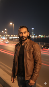 Create a cinematic night-time urban portrait of a young adult man standing beside a busy city road near a waterfront. He faces the camera with a calm, serious expression and a relaxed, confident posture. He wears a dark t-shirt layered with a brown leather jacket, simple and timeless. Streetlights cast warm highlights across the scene while city traffic moves behind him, creating soft motion blur and light streaks. Reflections from nearby water and distant buildings add depth and atmosphere. The subject remains sharply focused while the background stays softly dynamic. The image features shallow depth of field, realistic skin tones, controlled highlights, subtle grain, and a cinematic color grade. Photorealistic lifestyle photography, urban night mood, natural city lighting, confident presence, aspect ratio 3:4. use my uploaded photo for reference.