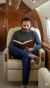 Create a photograph of a man seated in a cream leather seat inside a private jet cabin, one leg crossed over the other, reading a leather bound book. He wears a fitted charcoal cashmere sweater, tailored navy trousers, and brown suede loafers without socks. A luxury watch catches the light on his wrist. The interior features polished wood accents and soft ambient cabin lighting. Warm intimate lighting, shallow depth of field focusing on the subject, sophisticated and understated mood. Use aspect ratio 4:5. uploaded photo for reference.