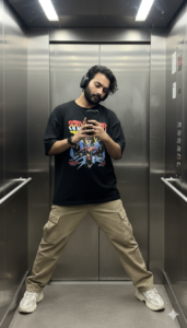 Create a viral Gen-Z mirror selfie of a young adult man in an elevator, wide relaxed stance, phone held near face, head slightly tilted, wearing a baggy t-shirt, loose cargo pants, chunky sneakers, headphones around the neck, moody artificial lighting, imperfect mirror reflections, urban raw aesthetic, high realism, trending Instagram street look. Use aspect ratio 4:5. use myuploaded photo for reference.