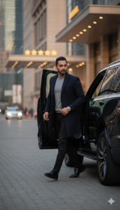 Create a luxury lifestyle photo of a man stepping out of a luxury SUV parked near a five-star hotel, confident mid-step posture with one foot on the pavement, wearing a tailored navy coat over a fitted sweater, slim trousers, luxury watch visible, clean haircut, focused expression, evening city lighting, subtle reflections on car surface, cinematic lifestyle photography, premium Instagram look. Use aspect ratio 4:5. use my uploaded photo for reference.