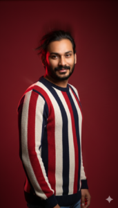 Create a striking studio portrait of a young adult man framed from the chest up, facing the camera with a relaxed, confident smile. His hair is slightly messy and natural, adding character and movement. He wears a bold knit sweater with vertical stripes in red, cream, and dark tones, creating strong visual contrast. Dramatic directional lighting illuminates his face, producing crisp highlights and soft shadows while keeping skin tones natural. The background is a deep red backdrop enhanced with a subtle radial motion blur effect that radiates outward, adding energy without distracting from the subject. The face remains sharp and in clear focus while the edges of the frame carry gentle motion blur. The image features high detail, realistic texture, controlled contrast, and a polished editorial color grade. Photorealistic studio portrait photography, bold styling, dynamic background effect, sharp subject focus, no flat lighting, aspect ratio 3:4. use my uploaded photo for reference.