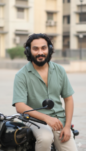 Create a warm, natural lifestyle portrait of a man sitting casually on a motorcycle in an outdoor urban courtyard. He leans slightly forward with one arm resting on his knee and the other near the handlebar, creating a relaxed, approachable posture. He wears a loose, breathable sage-green button-up shirt with the top buttons open, paired with light beige trousers for a soft, contemporary look. He has thick, slightly messy curly hair, a full well-groomed beard, and a gentle, confident smile. Over-ear wireless headphones rest comfortably on his head, suggesting he’s immersed in music or enjoying a quiet moment. His expression feels calm, friendly, and content. The motorcycle is classic and understated, partially visible, adding character without overpowering the subject. The background features muted architectural elements, softly blurred to maintain focus on the subject while grounding the scene in a real, lived-in environment. Lighting is soft natural daylight, evenly illuminating the face and clothing with minimal shadows. The color palette is fresh and harmonious: greens, neutrals, and warm skin tones. Depth of field is shallow, producing a gentle bokeh that enhances intimacy. Use aspect ratio 4:5. use myuploaded photo for reference.