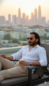 Create a luxury lifestyle scene of a man seated on a rooftop lounge overlooking a modern skyline, relaxed posture leaning slightly back with one arm resting on the chair and the other holding a glass, wearing a crisp white linen shirt with sleeves rolled up, slim-fit beige trousers, luxury sunglasses, leather strap watch, well-groomed hair, composed expression, sunset lighting casting warm tones, city lights beginning to glow, premium cinematic photography style, high contrast, stylish Instagram look. Use aspect ratio 4:5. use my uploaded photo for reference.
