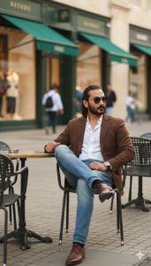 Create a luxury lifestyle portrait of a man sitting at an outdoor café in a high-end European-style street, relaxed posture with legs crossed and elbow resting on the table, wearing a tailored brown blazer, white shirt, dark sunglasses, leather shoes, subtle accessories, calm confident expression, soft natural daylight, blurred luxury storefronts in background, fashion editorial photography style, refined Instagram mood. Use aspect ratio 4:5. use my uploaded photo for reference.