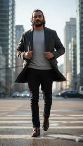 Create a candid street photography image of a man crossing the road mid-stride, captured from a low angle as his coat moves slightly with motion, wearing a charcoal overcoat over a gray sweater, tailored trousers, and leather shoes, one hand adjusting his coat collar while the other swings naturally, focused expression, city buildings rising behind him, strong directional sunlight creating long shadows, crisp contrast, slight motion blur in the legs, and a natural unposed feel. Use aspect ratio 3:4. use my uploaded photo for reference.