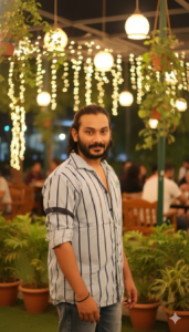 Create an outdoor night-time lifestyle portrait of a young adult man standing in a cozy café or garden setting illuminated by warm hanging lights. He stands in a relaxed, natural posture with a gentle, confident smile directed toward the camera. His outfit is casual-smart, featuring a light-colored button-up shirt with sleeves rolled slightly for an easy, approachable look. Soft ambient lighting from decorative lamps and string lights surrounds him, creating warm bokeh and a festive atmosphere. Green plants and foliage frame the scene, adding depth and visual balance. The lighting is warm and flattering, with even exposure on the face and soft shadows. The background remains lively yet softly blurred to maintain focus on the subject. The image features shallow depth of field, realistic skin tones, subtle grain, and a warm editorial color grade. Photorealistic lifestyle photography, natural expressions, evening ambiance, cozy mood, no harsh lighting, aspect ratio 3:4.use my uploaded photo for reference.