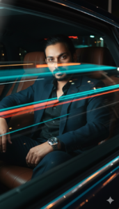 Create a stylish night city lifestyle portrait of an adult man sitting in the back seat of a car, relaxed posture with one arm resting on the door, wearing a dark blazer over a black shirt, tailored trousers, luxury watch visible, composed expression, city lights streaking through the window, reflections on glass, premium cinematic lifestyle shot. Use aspect ratio 4:5. use my uploaded photo for reference.