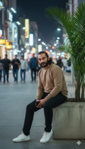 Create an urban night-time lifestyle portrait of a young adult man seated casually on a large concrete planter along a busy pedestrian street. He sits with a relaxed posture, one leg extended and the other bent, hands resting naturally, projecting quiet confidence and calm focus. His expression is serious yet approachable, with direct eye contact toward the camera. He wears a neutral brown sweatshirt paired with black trousers and clean white sneakers, simple and modern. Behind him, a palm plant rises upward, adding visual structure and depth. The background features a lively city street with softly blurred pedestrians, glowing storefront signs, and colorful night lights creating natural bokeh. Ambient city lighting illuminates the subject evenly without harsh shadows. The image has a shallow depth of field, realistic skin tones, subtle grain, and a balanced cinematic color grade. Photorealistic lifestyle photography, street-style editorial mood, natural urban lighting, no artificial glow, aspect ratio 3:4. use my uploaded photo for reference.