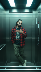 Create a casual street-style mirror photo of a young adult man inside a metallic elevator, leaning lightly against the wall with relaxed shoulders, phone held near the face, effortless posture, wearing a graphic t-shirt layered with an open flannel shirt, relaxed-fit cargo pants, sneakers, urban fashion vibe, soft artificial lighting reflecting off metal surfaces, cinematic shadows, moody tones, high realism, trendy Instagram look. Use aspect ratio 4:5. use myuploaded photo for reference.