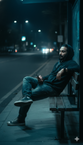 Create a moody street photography portrait of a young man sitting on a bus stop bench late at night, leaning back slightly with one arm stretched across the bench and the other holding a phone, wearing a dark hoodie, loose jeans, and sneakers, hood partially up, posture relaxed yet tired, cool-toned streetlights casting soft shadows, empty road behind him, realistic noise, shallow depth of field, and a quiet urban solitude mood. Use aspect ratio 3:4. use my uploaded photo for reference.