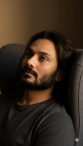 Create an intimate, moody close-up portrait of an adult man reclining against a soft fabric couch or chair, captured in a quiet moment of introspection. The framing is tight on the face and upper torso, emphasizing emotion and vulnerability. His head is slightly tilted back, eyes gazing upward and away from the camera, as if lost in thought or memory. He has naturally wavy, slightly tousled dark hair falling loosely across his forehead, thick expressive eyebrows, and deep, reflective eyes. His expression is calm yet emotionally layered, soft, distant, and contemplative. use my uploaded photo for reference.