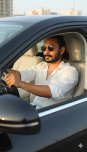 Create a lifestyle portrait of a young adult man seated confidently in the driver’s seat of a modern car. He holds the steering wheel naturally, facing forward with a calm, focused expression that conveys quiet confidence. He wears a clean white shirt styled casually with the top buttons open, paired with minimal accessories such as a thin chain necklace. Dark sunglasses add a refined, composed presence. Warm natural daylight filters through the car windows, softly illuminating his face and creating realistic skin tones. The interior features light-colored upholstery that enhances a premium, minimal aesthetic. The background outside the car is gently blurred to maintain focus on the subject. The image has balanced contrast, subtle grain, and a clean editorial finish. Photorealistic lifestyle photography, natural light, confident masculine energy, modern aesthetic, no harsh shadows, aspect ratio 3:4. use my uploaded photo for reference.