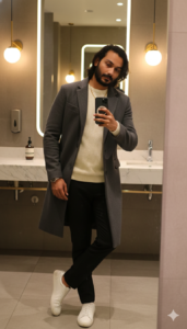 Create a fashion-forward mirror selfie of a young adult man in a modern café restroom, slightly leaning toward the mirror with confident posture, phone held casually, wearing a long coat layered over a knit sweater, tailored pants, stylish sneakers, subtle accessories, warm indoor lighting with soft shadows, aesthetic background elements, premium lifestyle Instagram vibe, ultra-realistic details, professional photography look. Use aspect ratio 4:5. use myuploaded photo for reference.