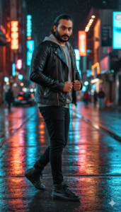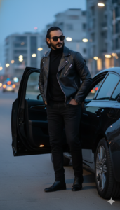 Create a cinematic urban fashion portrait of a confident adult man stepping out of a sleek black car on a modern city street at dusk. He stands beside the open car door, mid-motion, projecting confidence, composure, and understated power. His posture is relaxed yet commanding, with one hand near his pocket and his body angled slightly toward the camera. He has neatly styled dark hair with clean volume and structure. His face is partially shielded by dark, rectangular sunglasses, adding mystery and sophistication. He wears a fitted black turtleneck layered under a tailored black leather jacket with a subtle sheen, complemented by slim black trousers, minimal, monochrome, and refined. use my uploaded photo for reference.