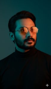Create a striking, futuristic close-up portrait of a man captured from the shoulders up, facing slightly upward and off to the side, as if gazing toward a distant light source. His expression is calm, confident, and introspective, projecting modern sophistication and quiet intensity. He has neatly styled medium-length hair swept back with volume and a well-groomed short beard. He wears round, translucent-frame glasses with warm amber/orange tinted lenses that glow vividly under the lighting, becoming the visual focal point of the image. The lighting is highly stylized and cinematic: cool teal-blue light washes across one side of the face and background, while warm orange light illuminates the opposite side, creating a dramatic color-contrast effect. The interplay of warm and cool tones sculpts the facial features and adds depth and futuristic atmosphere. He wears a minimalist black turtleneck or high-collar top, reinforcing a sleek, modern, fashion-forward aesthetic. The background is smooth and seamless, fading into rich teal tones with no visible texture or distractions. The overall mood is editorial, futuristic, and luxurious. Use aspect ratio 4:5. se my uploaded photo for reference.