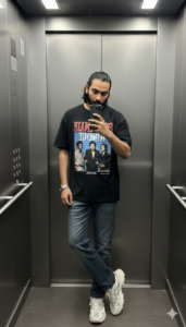 Create a trendy mirror selfie of a young adult man inside a modern elevator with brushed steel walls, casual lean with one shoulder against the wall, phone partially covering the face, wearing an oversized graphic t-shirt, straight-fit trousers, statement sneakers, watch accessory, soft moody lighting reflecting on metal surfaces, urban fashion mood, sharp details, authentic Instagram street style look. Use aspect ratio 4:5. use myuploaded photo for reference.
