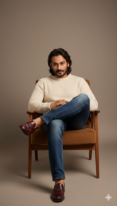 Create a studio portrait of a well-groomed adult man seated confidently in a mid-century style brown suede armchair. He sits in a relaxed, slightly reclined pose with one leg crossed over the other, projecting calm confidence and quiet sophistication. He has thick, wavy dark hair styled with natural volume, strong eyebrows, and deep-set expressive eyes. His expression is composed and introspective, looking directly at the camera. He wears a cream-colored, chunky knit sweater with a subtle ribbed texture, paired with dark blue straight-leg denim jeans and polished burgundy leather loafers. The outfit feels timeless, minimal, and elegant, modern casual with classic influences. use my uploaded photo for reference.