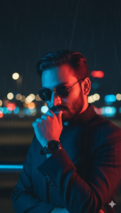 Create a cinematic night-time portrait of a young adult man standing in an urban setting illuminated by neon city lights. He is framed from the chest up and captured in a thoughtful pose, with one hand resting near his mouth as if lost in contemplation. His expression is serious and composed, projecting confidence and mystery. He wears round dark sunglasses that obscure his eyes, enhancing the cinematic mood. His hair is neatly styled with volume, paired with a well-groomed beard. He is dressed in a dark, modern outfit with a visible wristwatch for subtle detail. Dramatic dual-color lighting casts red tones across one side of his face and cool blue tones across the other, creating strong contrast and depth. The background is softly blurred with colorful city bokeh lights and a hint of rain or mist for atmosphere. The image features shallow depth of field, high contrast, crisp highlights, realistic skin texture, subtle grain, and a bold cinematic color grade. Photorealistic, neon-lit portrait photography, urban night aesthetic, dramatic lighting, high detail, no flat lighting, aspect ratio 3:4. use my uploaded photo for reference.