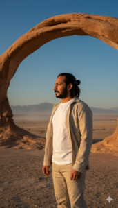 Create a striking outdoor portrait of an adult man standing beneath a massive natural sandstone rock arch in a desert landscape. The composition frames him from a slightly low angle, emphasizing scale and grandeur, with the curved stone arch forming a dramatic halo above his head. He is positioned confidently in the foreground, shown in side profile, gazing into the distance with a calm, resolute expression. His outfit is minimalist and earth-toned: a light beige linen or cotton jacket worn open over a plain white t-shirt, paired with matching beige trousers. The clothing feels breathable, refined, and travel-ready, blending seamlessly with the desert environment. use my uploaded photo for reference.