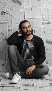Create an editorial studio portrait of a young adult man seated casually on the floor against a backdrop completely covered in overlapping newspaper pages. He sits with a relaxed posture, legs bent comfortably, one arm resting behind his head, projecting ease and quiet confidence. His expression is calm and introspective, with his gaze directed off-camera. He wears a black cardigan layered over a black-and-white striped t-shirt, paired with dark jeans and clean white sneakers for a modern, minimalist look. Thin-framed eyeglasses add an intellectual edge. Soft, controlled studio lighting illuminates his face evenly, creating gentle shadows and clear texture without harsh contrast. The newspaper-covered background adds depth and narrative interest while remaining muted and cohesive. The image features sharp subject focus, realistic skin tones, subtle grain, and a clean editorial color grade. Photorealistic fashion portrait photography, studio setup, relaxed pose, modern styling, no dramatic lighting, aspect ratio 3:4. use my uploaded photo for reference.