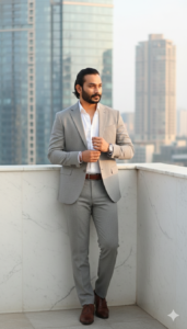 Create a sophisticated indoor fashion portrait of a refined man leaning casually against a minimalist wall in a modern interior corridor. He stands in a relaxed pose, legs crossed at the ankles, head slightly tilted downward as he adjusts the cuff of his sleeve, conveying calm confidence and effortless class. He has neatly groomed dark hair, a well-trimmed beard, and wears dark, angular sunglasses that add a discreet air of mystery. His outfit is impeccably tailored: a camel-colored suit with sharp structure and clean lines, paired with a light blue dress shirt worn open at the collar. A rich red pocket square provides a bold yet tasteful accent, complemented by matching red socks and polished brown leather dress shoes. The setting is a clean, modern interior with soft grey walls and a frosted glass door behind him. The environment is minimal and uncluttered, allowing the outfit and posture to dominate the frame. Lighting is soft, natural, and directional, creating gentle shadows that sculpt the suit’s texture and enhance facial features without harsh contrast. The color palette is elegant and balanced: warm camel tones, cool blues, muted greys, and subtle red accents, producing a premium editorial look. Use aspect ratio 4:5. use my uploaded photo for reference.