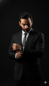Create a striking black-and-white studio portrait of an elegant, well-dressed man in a tailored dark suit. The composition is waist-up, slightly off-center, with the subject looking downward in a contemplative, focused moment as he adjusts the cuff of his suit jacket. One hand gently grips the sleeve while the other reveals a luxury stainless-steel wristwatch, which becomes the visual focal point of the image. He has neatly styled short hair, a clean-shaven face, strong jawline, and sharp, masculine features. His expression is calm, serious, and introspective, conveying confidence, discipline, and refined taste. The suit is impeccably fitted with crisp lines, worn over a white dress shirt and a slim, understated tie. The background is a seamless white studio backdrop, minimal and distraction-free, enhancing the contrast and timeless feel. Lighting is soft yet directional, sculpting facial structure and suit texture with elegant shadows. The entire image is rendered in high-contrast monochrome, with deep blacks, clean whites, and rich mid-tones for a classic luxury editorial look. Use 4:5 aspect ratio. use my uploaded photo for reference.