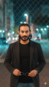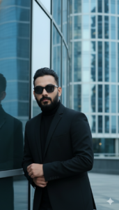 Create a cinematic urban portrait of a confident man standing outdoors among towering glass skyscrapers. He is positioned slightly off-center, leaning casually near a reflective glass façade, captured from the waist up. His posture is relaxed yet assertive, projecting quiet authority and self-assured confidence. He has short, textured dark hair styled upward, a well-groomed full beard, and wears dark, minimal sunglasses that obscure the eyes and add an air of mystery. His expression is calm, composed, and serious. He is dressed in a sleek black jacket with a high collar, layered over dark innerwear, creating a sharp, contemporary silhouette. The background features modern high-rise buildings with blue-tinted glass, vertical lines, and repeating geometric patterns. The architecture frames the subject, emphasizing scale, ambition, and modern city life. Reflections in the glass subtly echo the urban environment. Lighting is natural and cool-toned, with soft overcast daylight creating even illumination and gentle contrast. The color palette is dominated by cool blues, greys, and blacks, reinforcing a modern, corporate-luxury mood. Depth of field is shallow enough to keep the subject crisp while slightly softening the background towers. Use 4:5 aspect ratio. use my uploaded photo for reference.