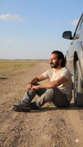 Create a cinematic road trip photo of an adult man sitting cross-legged on the ground beside a parked car, relaxed grounded posture with hands resting on knees, wearing a breathable t-shirt, cargo pants, trail shoes, slightly tousled hair, calm introspective expression, wide open plateau landscape, clear sky with subtle clouds, late afternoon natural light, cinematic clarity, professional adventure travel photography. Use aspect ratio 4:5. use my uploaded photo for reference.