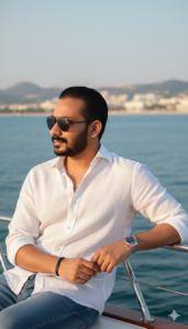 Create a cinematic lifestyle portrait of a confident, well-groomed man seated comfortably on a luxury boat during a calm, sunlit day. He is captured from the waist up, leaning slightly back with one arm resting casually on the wooden railing, gazing off to the side toward the horizon with a composed, thoughtful expression. He has neatly styled short dark hair, a well-trimmed beard, and wears classic dark sunglasses that enhance a refined, masculine look. His outfit is effortlessly elegant: a crisp white button-up shirt with the top buttons undone, sleeves casually rolled to the forearms, paired with light neutral trousers. A subtle luxury wristwatch adds understated sophistication. The background features tranquil blue water with a softly blurred coastal cityscape and distant hills or mountains, suggesting a Mediterranean or seaside setting. The atmosphere feels calm, exclusive, and aspirational. Lighting is natural and warm, as if shot during late morning or golden afternoon light, casting soft highlights on skin and fabric while maintaining realistic shadows. Colors are clean and balanced: whites, warm skin tones, soft blues, and natural wood accents. Use 4:5 aspect ratio. use my uploaded photo for reference.