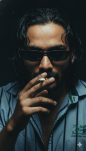 Create an extreme close-up cinematic portrait of a man’s face in low-key lighting, captured with razor-sharp detail. His skin is wet with fine water droplets, beads of moisture clinging to his forehead, cheeks, eyelashes, and jawline, creating a tactile, almost rain-soaked texture. Strands of damp hair fall naturally across his forehead, slightly disheveled. He wears narrow black rectangular sunglasses. The gesture feels deliberate and confrontational, as if caught mid-moment. Lighting is dramatic and directional, sculpting facial structure and emphasizing pores, droplets, and skin texture. Highlights catch on the water beads and sunglasses, while deep shadows fall into the background, which is completely dark and minimal, isolating the subject. The color palette is restrained and moody, deep blacks, muted skin tones, and subtle cool highlights. The image feels like a high-end fashion editorial fused with neo-noir cinema, charged with tension, mystery, and quiet power. Use aspect ratio 4:5. use myuploaded photo for reference.