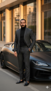 Create a luxury lifestyle portrait of a confident man standing beside a matte black supercar in an upscale city street, relaxed upright posture with one hand in his trouser pocket and the other resting lightly on the car door, wearing a tailored charcoal suit with a fitted black turtleneck, polished leather loafers, minimalist wristwatch, clean haircut, subtle stubble, calm confident expression, golden hour lighting reflecting off glass buildings, shallow depth of field, cinematic color grading, premium fashion photography style, ultra sharp details, realistic skin texture, high-end Instagram aesthetic. Use aspect ratio 4:5. use my uploaded photo for reference.