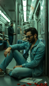 Create a cinematic, moody portrait of a young man standing inside a subway train carriage, captured in a quiet, introspective moment. He leans casually against the interior wall near a subway route map, head slightly bowed, eyes hidden behind dark sunglasses. He has tousled dark hair, light stubble, and wears a worn blue denim jacket layered over a white tank top, giving him a raw, effortless, street-level style. A thin necklace and subtle chest hair add realism and intimacy to the portrait. His posture feels solitary and inward-looking, as if disconnected from the movement around him. The subway interior is gritty and lived-in: metal poles, scratched walls, fluorescent overhead lights, and motion-blurred passengers in the background. A folded newspaper lies abandoned on the floor, along with scattered rose petals, adding quiet symbolism and emotional contrast to the industrial setting. Lighting is cinematic and low-key, with cool teal and green tones from the train lights mixed with warmer highlights on the subject’s face and hands. The background falls into soft motion blur, emphasizing isolation amid urban movement. Slight film grain enhances the realism and indie-film atmosphere. Use aspect ratio 4:5. use myuploaded photo for reference.