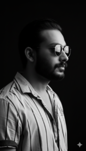 Create a striking black-and-white close-up profile portrait of a man captured from the side, filling the frame from forehead to chin. He faces toward the light, gazing forward with a calm, focused, introspective expression that conveys confidence and restraint. He has neatly styled hair swept back, a well-groomed full beard, and wears sleek, round metal-frame sunglasses with dark lenses. The glasses subtly reflect the light source, adding a refined, cinematic highlight without revealing the eyes. The background is deep black and seamless, dissolving into shadow with no visible detail. Skin texture is realistic and detailed, with soft transitions between highlights and shadow. The overall tone is elegant, moody, and timeless, evoking luxury fashion editorials and classic film portraiture. Use aspect ratio 4:5. use my uploaded photo for reference.