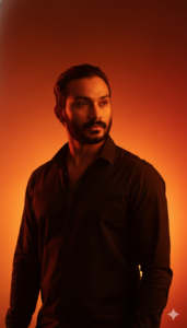 Create a striking cinematic portrait of a man framed from the chest up, photographed from a slightly low angle to emphasize strength, leadership, and heroism. He faces slightly off-camera, gaze fixed forward with a calm, determined expression, stoic, confident, and unshaken. He wears a minimal black collared shirt with a clean, modern cut, understated and timeless, reinforcing a grounded, no-nonsense presence. His hair is neatly styled, masculine and practical. The background is a bold, seamless gradient of intense fiery orange and red tones, glowing like a sunset or controlled blaze. Lighting is dramatic and cinematic: a strong warm key light illuminates one side of his face, while soft shadows sculpt the other, creating depth and heroic contrast. Subtle rim lighting separates him from the background, enhancing silhouette and stature. Color grading is rich and saturated, with warm highlights and deep shadows. The image feels like a movie poster, superhero origin story, or cinematic character reveal—powerful, minimal, and iconic. Use aspect ratio 4:5. use myuploaded photo for reference.