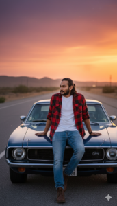 Create a cinematic road trip photo of an adult man sitting on the hood of a classic car, casual confident posture with elbows resting behind him for support, wearing a flannel shirt over a plain t-shirt, rugged jeans, worn leather boots, light stubble beard, thoughtful expression, long open highway at sunset, sky painted with orange and purple tones, reflections on the car surface, cinematic depth, professional travel photography style. Use aspect ratio 4:5. use my uploaded photo for reference.