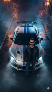 Create an ultra-realistic cinematic night scene shot from an extreme top-down bird’s-eye view, featuring a modified high-performance sports car parked on a rain-soaked urban street. The car is metallic silver with bold electric-blue racing stripes running down the hood and roof, aggressive hood vents, a large rear spoiler, and glowing LED headlights cutting through the mist. A confident man stands casually beside the front of the car, leaning slightly against the bumper. He wears a black jacket, dark jeans, and black boots, with sleek dark sunglasses despite the night setting. He has short styled hair, a trimmed beard, and a calm, dominant expression, looking upward toward the camera. His posture conveys control, confidence, and modern urban power. The street surface is wet and reflective, mirroring neon signage, headlights, and blue underglow lighting beneath the car. Steam rises from street vents and the asphalt, drifting through the scene and adding depth and atmosphere. Blue accent lighting spills across the ground, contrasting with warm orange reflections from nearby storefront lights. Lighting is cinematic and high-contrast: cool blue neon highlights, warm urban reflections, sharp headlight beams, and soft volumetric steam. Raindrops bead across the car’s surface, emphasizing texture and realism. Use aspect ratio 4:5. use myuploaded photo for reference.