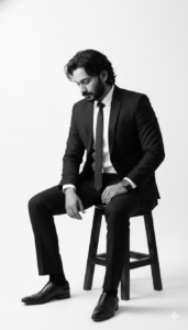 Create a minimalist black-and-white studio portrait of an adult man seated on a simple stool against a seamless white background. He is dressed in a sharply tailored classic black suit with a crisp white dress shirt and a slim dark tie. His posture is relaxed yet introspective, leaning slightly forward, legs apart, one hand resting loosely on his thigh while the other hangs naturally, revealing a refined wristwatch. His head is tilted downward, eyes cast toward the floor, conveying quiet contemplation, humility, and emotional depth. He has thick, well-styled dark hair with natural volume and texture, paired with a neatly groomed beard that frames his face cleanly. His facial expression is calm, thoughtful, and understated. use my uploaded photo for reference.