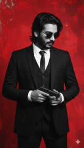 Create a striking neo-noir fashion portrait of a man dressed in a sharp black three-piece suit, white dress shirt, and slim black tie, carrying a gun in the hands. He faces slightly downward and to the side, head tilted with a brooding, introspective expression. His presence feels controlled, distant, and powerful—like a stylish anti-hero caught between worlds. He has medium-length wavy dark hair falling loosely around his temples, a well-groomed beard, and wears round black sunglasses that completely conceal his eyes, amplifying mystery and authority. His posture is relaxed yet deliberate, conveying confidence without effort. The subject is rendered in dramatic black and white, while the background is a rich, textured crimson red, creating intense contrast and visual impact. The red backdrop feels symbolic and emotional, evoking danger, passion, rebellion, and cinematic tension. Lighting is moody and directional, sculpting facial features and suit fabric with subtle highlights and deep shadows. Fine film grain and painterly texture add an editorial, poster-like quality. The image feels like a luxury fashion campaign, noir graphic novel cover, or arthouse film poster. Use aspect ratio 4:5. use myuploaded photo for reference.