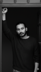 Create a dramatic, intimate portrait of a man leaning against a textured wall, captured in a narrow beam of warm, directional light that cuts across his face and upper body. Strong shadows dominate the frame, partially obscuring the subject and creating a sense of mystery, introspection, and quiet intensity. He has very short, closely cropped dark hair, a neatly trimmed beard, and sharp, expressive eyes that look directly toward the camera with a vulnerable yet confident gaze. His expression feels raw and contemplative. One hand is raised near his chin in a subtle thinking gesture, adding emotional depth and realism. He wears a minimalist black outfit, dark top with a clean silhouette, accented by a thin silver chain necklace and a metallic wristwatch, both catching faint highlights from the light source. The environment is minimal and textured: a rough concrete or plaster wall on one side, fading into deep shadow on the other. Dust particles are visible floating in the light beam, enhancing the cinematic atmosphere. Lighting is low-key and highly directional, resembling late-afternoon sunlight streaming through a narrow window or blinds. Contrast is strong, with warm highlights and deep blacks. The color palette is muted and earthy, emphasizing skin tones and shadow detail. Use aspect ratio 4:5. use my uploaded photo for reference.