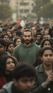 Create a powerful cinematic portrait set within a dense public protest or demonstration. In the center of the frame stands a young adult man, surrounded tightly by a moving crowd, yet visually isolated through shallow depth of field. He faces the camera directly with a serious, contemplative expression, calm, resolute, and emotionally grounded amid chaos. His eyes are intense and reflective, conveying quiet determination, uncertainty, or inner conflict. He wears muted, practical clothing, such as a simple hoodie in earthy, desaturated tones, blending into the crowd rather than standing out through fashion. use my uploaded photo for reference.