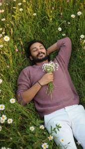 Create a serene, top-down portrait of a young man lying peacefully in a lush meadow filled with wildflowers. He rests on his back among tall green grass, white daisies, and scattered pink blossoms, completely immersed in nature. One arm is bent behind his head in a relaxed pose, while the other gently holds a small bouquet of freshly picked daisies against his chest. He has soft, natural facial features, light stubble, and slightly tousled dark hair. His eyes are closed with a faint, content smile, conveying calmness, tenderness, and quiet joy. His expression feels intimate and emotionally warm, as if caught in a private moment of rest and reflection. He wears a textured mauve or dusty-rose knit sweater paired with clean white trousers, creating a gentle contrast against the vibrant greens and florals. The outfit feels cozy, romantic, and timeless. The scene is bathed in warm, natural daylight, soft afternoon, sunlight filtering through leaves and petals. Highlights gently kiss the skin and flowers, while shadows remain soft and organic. Foreground leaves and flowers partially frame the subject, adding depth and a dreamy, cinematic feel. Colors are rich yet natural: lush greens, creamy whites, soft yellows, and muted pinks, with a harmonious, film-like color grade. Use aspect ratio 4:5. use my uploaded photo for reference.
