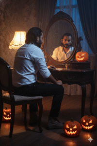 A young Boy with the exact same face as the uploaded image sits at a wooden vanity in a dimly lit room, boy wearing white sleeve folded shirt and black pant. softly illuminated by the warm glow of a table lamp, creating a nostalgic, eerie calm. like halloween scary vibes. (use my photo which i uploaded as here) Boy looking at mirror while camera click from behind looking at mirror to camera. also add some glowing pumpkins, realitic and cinematic
