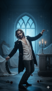 Category Details for a Cinematic Look Concep:t Melancholy, doomed, but beautiful eternal love, drawing inspiration from films like Crimson Peak or classic monster romances. Elegant, but deliberately tattered or decaying formal wear—luxe fabrics (velvet, lace, silk) in dark tones (oxblood, charcoal, black). Heavy, slightly theatrical makeup for pallor. Props: An antique candelabra, a long black feather, wilted roses, or dust sheets draped over furniture.Staging/PoseThe Dance: A wide shot to emphasize the location. The Boy holds a formal dance pose (waltz/dip), but with an air of tragedy. The pose should look like a frozen moment just before separation.LightingEthereal Backlight: The main light should come from a window or a high source behind the couple, creating a soft, halo-like rim. Practical Light: Use a few lit candles or a distant, dim chandelier to add soft, warm foreground highlights. The rest of the scene should fall into near darkness.Post-ProcessingCool Tones, Soft Focus/Glow: A slight blue or cyan shift in the shadows to emulate moonlight. Add a subtle Orton effect (soft glow) to the highlights. Keep the contrast gentle but moody. (use My photo which i uploaded here)
